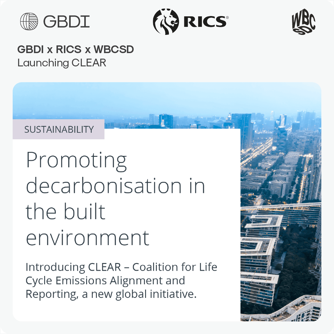 Founded by RICS, WBSCD, and GBDI, the Coalition for Life Cycle Emissions Alignment and Reporting (CLEAR) is a global coalition established to address a critical barrier to decarbonizing the built environment: the fragmentation and inconsistencies of whole life cycle assessment (WLCA) methods and reporting. Multiple standards and tools exist globally, but differences in scope, assumptions, and reporting approaches limit comparability and hinder effective policy, investment, and design decisions. CLEAR responds to the need for clarity, consistency and credibility in carbon reporting, enabling stakeholders to better measure, manage, and reduce emissions across the value chain.
